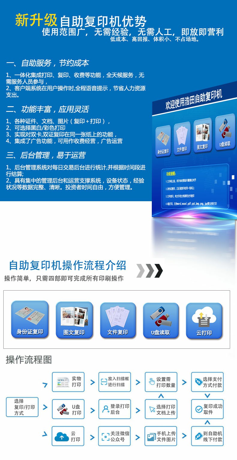 自助共享復(fù)印機價格有多種版本,有標準版價格,有標準版+廣告屏價格,有標準版+彩色復(fù)印功能價格,也有自助復(fù)印機定制價格,