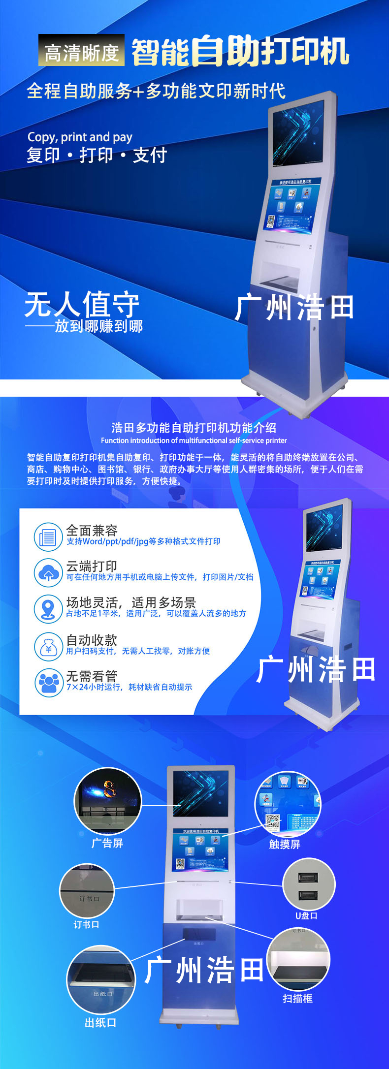 自助復(fù)印機市場前景:共享智能復(fù)印系統(tǒng)在校園打印設(shè)備上有足夠的驚艷,它的使用操作方法簡單,支付方式多樣,能為廣大師生提供一個便捷的復(fù)印打印平臺。廣州浩田自助終端系統(tǒng)聯(lián)系電話:400-030-2780