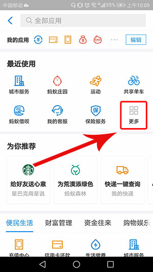 打開手機支付寶APP,注冊賬號,在軟件里找到更多服務(wù)。