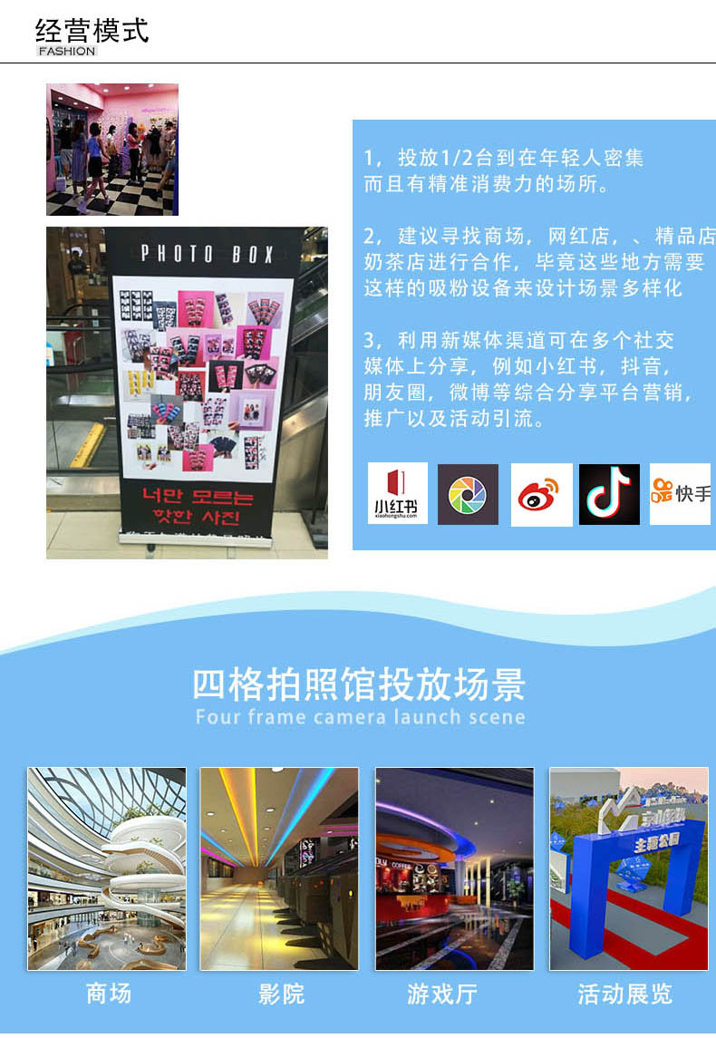 投放地點建議在年輕人密集且有精準消費力的場地可擺放1/2臺設備..建議尋找商場、網紅店、精品店、奶茶店等進行合作,畢竟這些方需要這樣的吸粉設備來設計場景多樣化。.利用新媒體渠道可在多個社交媒體上分享,如小紅書、抖音、朋友圈、微博、貼吧等平臺進行營銷、推廣甚至活動引流。
